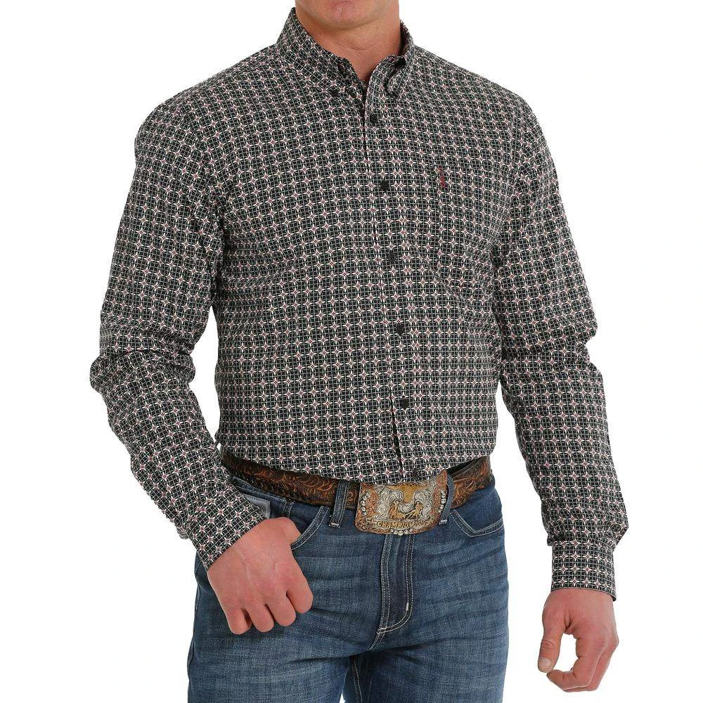 Clean up to get noticed in a Modern Fit black printed cotton plain weave like this one engineered by CINCH. Featuring an open left front pocket, embroidered logo and black buttons, this handsome shirt accents any blue jeans or slacks in the stack.