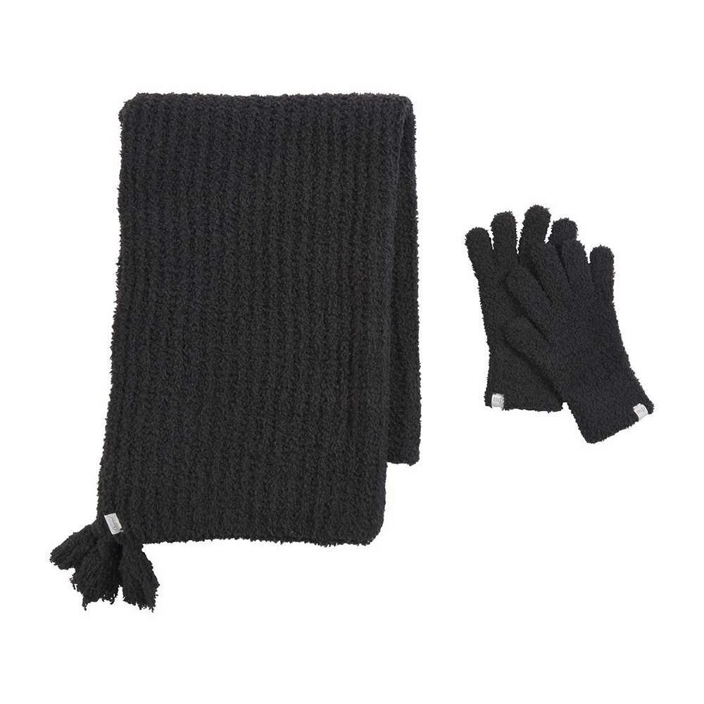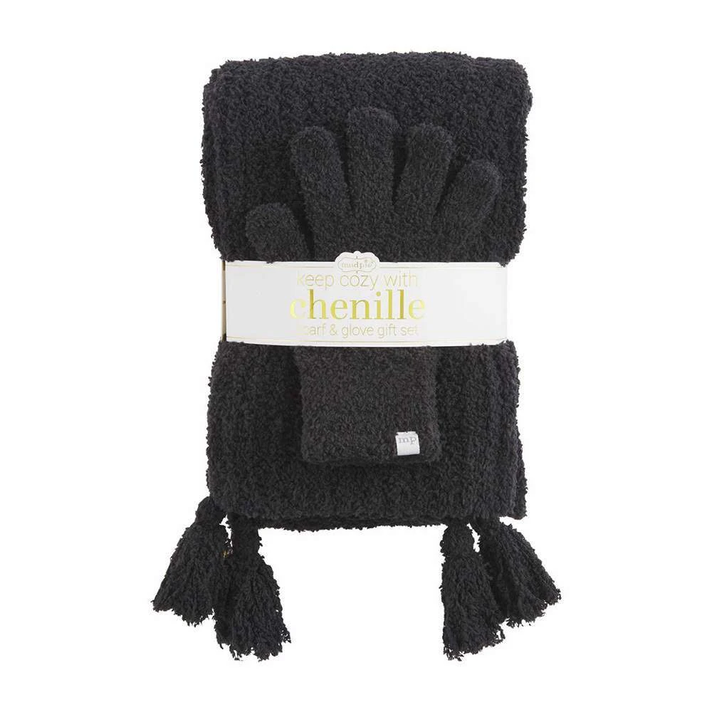 2-piece set. Chenille knit scarf with corner tassels arrives packaged with coordinating pair of gloves.