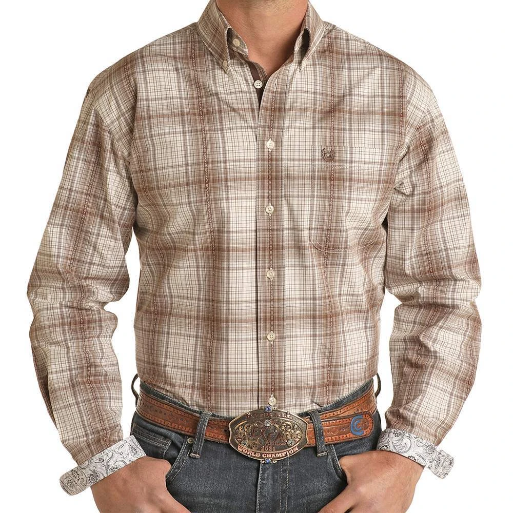 Panhandle Men’s Tan Dobby Plaid Long Sleeve Button Down