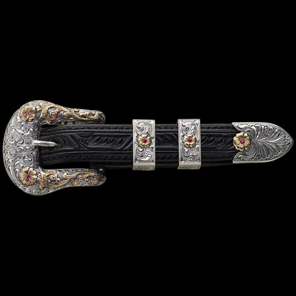 A classic buckle set, The Visalia features a lightly antiqued, hand-engraved, solid sterling base with a slightly domed design. Each hand-cut 14 karat gold fill flower on the keepers and tip is accented with a genuine red ruby.